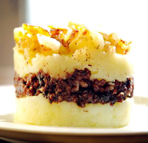 Po 20 minutach odcedzamy ziemniaki, odparowujemy wodę. Masło rozpuszczamy, wlewamy do ziemniaków i dokładnie ugniatamy na gładkie puree. Upieczoną kaszankę wyjmujemy ze skórki do miseczki (skórkę jeśli lubicie zejdźcie jest pyszna). I teraz potrzebna nam będzie metalowa obręcz cukiernicza. Na dnie układamy warstwę puree, następnie warstwę kaszanki (więcej niż ziemniaków), znowu warstwę ziemniaków, a na koniec łyżka smażonej cebuli z jabłkiem. Zdejmujemy obręcz i mamy piękną piramidkę, która smakuje wybornie 🙂