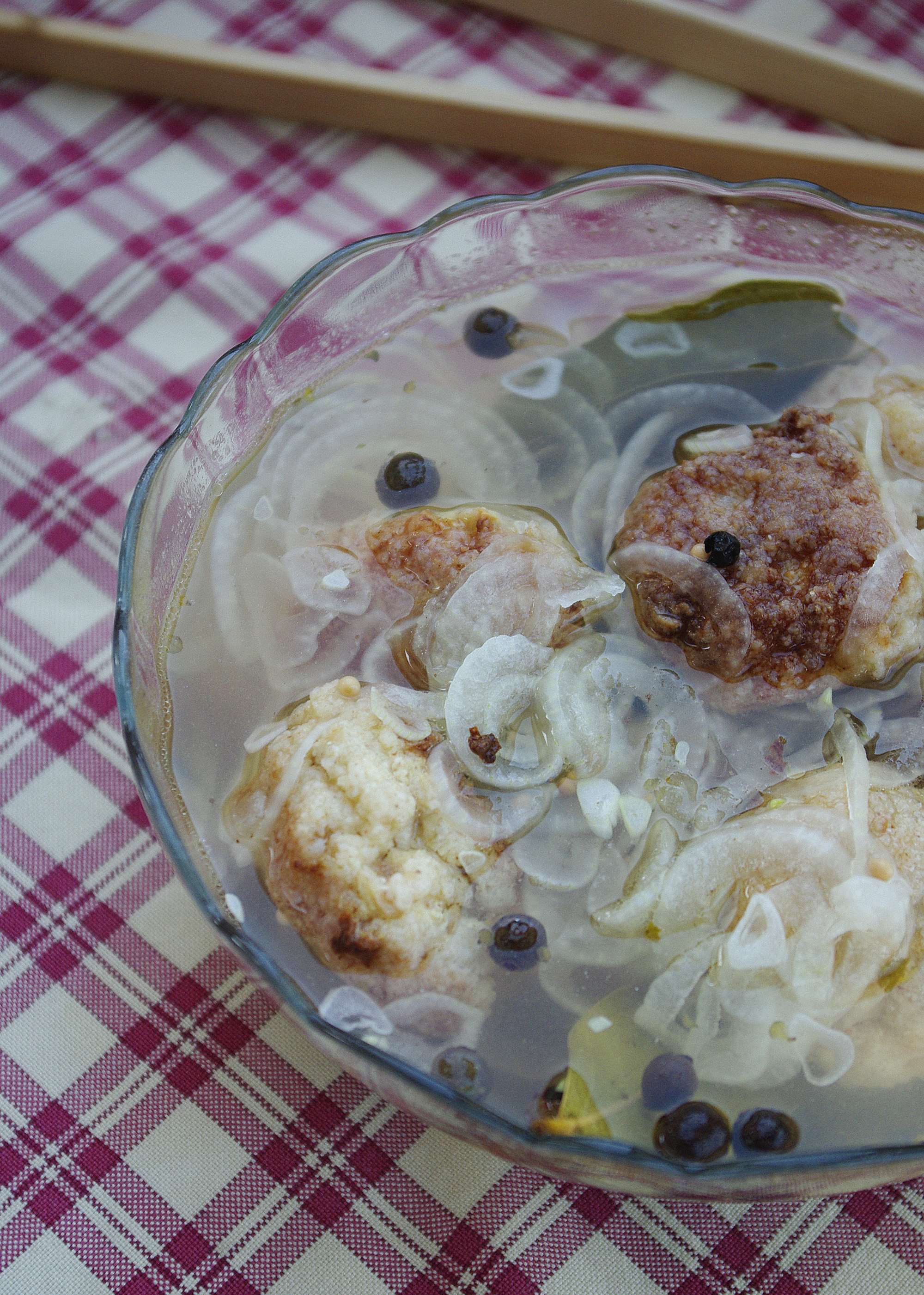 z mielonym mięsem z dorsza, dodjamy jajko, znów dokładnie miezsamy (najlepiej rękoma). Solimy i pieprzymy. Formujemy klopsiki wielkości dużego orzecha włoskiego. Obtaczamy klopsiki w mące gryczanej i smażymy kilka minut, obracając klopsy na patelni. Tak żeby się lekko zrumieniły, ale nie spaliły. Jescze ciepłe klopsy układamy w misce. Cebulę kroimy w piórka i dorzucamy do klopsików. I teraz czas na zalewę. Zagotowujemy 1 szklankę octu z dwoma szklankami wody oraz zielem angielskim i liściem laurowym. Gorącą zaprawą zalewmy klopsiki.